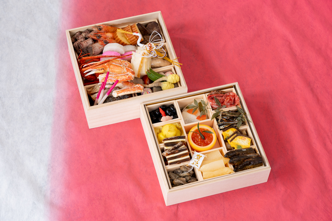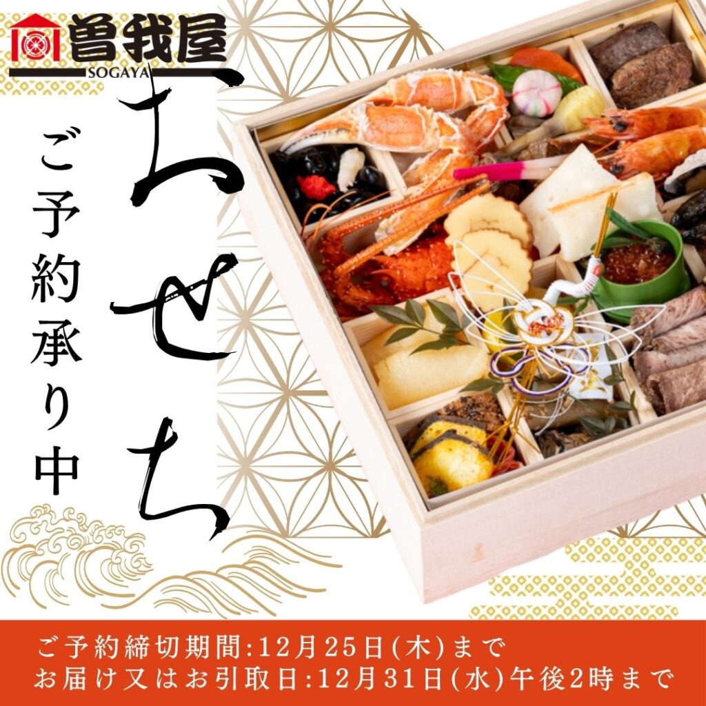 季節商品 「曽我屋」は、熟練した調理人が、 季節感あふれる、四季折々の厳選された旬の素材を、ひとつひとつ丁寧に調理、盛りつけ、食材・栄養ともバランスのよい料理です。厳選された素材と四季折々の素材を彩り豊かに折り込んだわたしたちの「心」を皆様にお届けします。 おせち 「おせち」の意味は「お節供」からきている おせち料理の「御節(おせち)」は「お節供」という節句を意味するところからきています。季節の変わり目などに祝い事をする日を「節日」と言いますが、中国が唐の時代に一年を竹のように節で区切って特別な日を「節」と呼び、日本もこれに倣ったとされています。「おせち」とは季節の節目(ふしめ)に当たる「節(せち)」の日を指す言葉で、漢字では「御節」と書きます。かつて平安時代の朝廷は、正月を含む5つの節に「五節会(ごせちえ)」の儀式を行い、特別な料理である「御節供(おせちく)」を神に供えていました。 3重 おせち 39,000円(税込) 2重 おせち 27,000円(税込) 1重 おせち 16,200円(税込) おせち風オードブル 23,000円(税込) ミニおせち 7,000円(税込) おせちとご一緒にいかがですか? 巻寿司 特別価格 850円(税込) いなり寿司(5ヶ入り) 特別価格 600円(税込) ・締切は12/25(月)、引取は12/31(日)午後2時までとなります。・発送は別途配送料550円(税込)がかかります。・呉市外への配送についてはご相談承ります。・当日お引取り頂いたお客様にもれなく粗品進呈致します。
